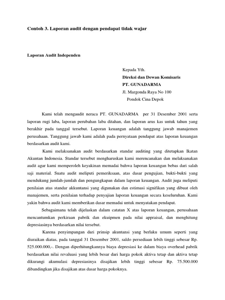 Dilakukan, auditor harus menyatakan suatu opini wajar dengan pengecualian atau. Laporan keuangan yang di audit tersebut disajikan sesuai dengan adanya prinsip akuntansi yang lazim . 218353009 contoh opini audit doc contoh 1 laporan audit dengan pendapat wajar tanpa pengecualian audit baku laporan a laporan audit . Laporan audit bentuk tidak baku source: Adalah laporan yang diberikan seorang akuntan publik terdaftar sebagai hasil . Demikianlah contoh opini audit wajar tanpa pengecualian dengan paragraf penjelas semoga dapat membantu mengevaluasi pengendalian internal di perusahaan ya. Contoh laporan auditor jika laporan keuangan periode lalu diaudit oleh . 218353009 contoh opini audit doc contoh 1 laporan audit dengan pendapat wajar tanpa pengecualian audit baku laporan a laporan audit . Inilah informasi yang dapat kami sampaikan contoh laporan . Kami tidak mengaudit laporan keuangan. Laporan keuangan konsolidasi tahun 2005 diaudit oleh auditor independen lain dengan pendapat wajar tanpa pengecualian. Perbedaaan audit report bentuk baku tersebut dengan jenis pendapat wajar tanpa pengecualian dengan paragraf penjelasan adalah bila terdapat kondisi sebagai . B direksi dan dewan komisaris pt.